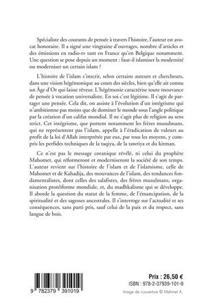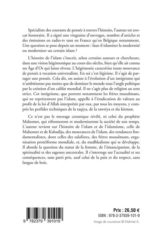 Cet ouvrage d'analyse historique vient jusqu'aux portes du présent. L’auteur est un spécialiste des mouvances de pensées à travers l’histoire. Il scanne l'islamisme sans langue de bois et apporte une réflexion nouvelle à la faveur d'un regard sur les liens secrets de l’Islam dès ses débuts et de nos jours. Il analyse l’Islam sous tous les angles et soulève d’importantes questions. Ce livre aborde sans tabous, l’histoire et les origines de l’Islam et de l'islamisme, celle de Mahomet, des premiers Mahométans, les mouvances secrètes et occultes, les liens avec le Wahhabisme, le Salafisme, la réalité des Frères musulmans et du madhkalisme. La Richesse de l’Islam et sa diversité sont une chose. Les actes et les projet de l'islamisme politique, d'un grand califat mondial, c'est autre chose. Sans islamophobie, avec lucidité et respect, l'auteur invite à s'interroger, à réfléchir et a la vigilance qui s'invite devant un certain choc entre les civilisations du 21e siècle. L’histoire de l’islam s’inscrit, selon certains auteurs et chercheurs, dans une vision hégémonique au cours des siècles, bien qu’elle ait connu un Âge d’Or qui laisse rêveur. L’hégémonie caractérise toute mouvance de pensée à vocation universaliste. En soi c’est légitime. Il s’agit de partager une pensée. Cela dit, on assiste à l’évolution d’un intégrisme qui n’ambitionne pas moins que de dominer le monde sous l’angle politique. Il ne s’agit plus de religion au sens strict. Cet intégrisme, que portent notamment les frères musulmans, qui ne représentent pas l’islam, appelle à l’éradication de valeurs au profit de la loi d’Allah interprétée par eux, par tous les moyens, y compris les perfides techniques de la taqiya, de la tawriya et du kitman, sur lesquelles l’auteur revient dans son texte. Ce n’est pas le message coranique révélé, ni celui du prophète Mahomet, qui réformera et modernisera la société de son temps. Les souhaits réactualisés de moderniser l’islam postulent une réforme de l’intérieur. L’autre branche de l’option serait d’adapter la modernité à l’islam des fondamentalistes, clous du cercueil de l’Occident des Lumières. Un islam des Lumières représenterait un progrès pour l’humanité en sa diversité constructive. Peut-il se convenir dans le cadre d'une alliance des lumières pour une humanité meilleure, en intégrant l'slam de paix? Quelles clés humanistes pour demain?