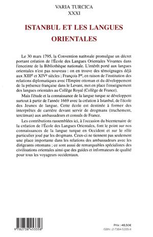 Le 30 mars 1795, la Convention nationale promulgue un décret portant création de l'École des Langues Orientales Vivantes dans l'enceinte de la Bibliothèque nationale. L'intérêt porté aux langues orientales n'est pas nouveau : on en trouve des témoignages déjà aux XIIIe et XIVe siècles ; François Ier, en raison de l'institution des relations diplomatiques avec l'Empire ottoman et du développement de la présence française dans le Levant, met en place l'enseignement des langues orientales au Collège Royal (Collège de France). Mais l'étude et la connaissance de la langue turque se développent surtout à partir de l'année 1669 avec la création à Istanbul, de l'école des Jeunes de langue. Cette école est destinée à former des interprètes de carrière devant servir de drogmans (truchement, tercüman) aux ambassadeurs et consuls de France. Les contributions rassemblées ici, à l'occasion du bicentenaire de la création de l'École des Langues Orientales, font le point sur nos connaissances de la langue turque en Occident et sur le rôle particulier joué par les drogmans. Ceux-ci ne tiennent pas seulement une place importante dans les relations des ambassadeurs avec les dirigeants ottomans ; ce sont aussi de remarquables spécialistes des civilisations orientales ainsi que des guides et informateurs de qualité pour tous les voyageurs occidentaux.