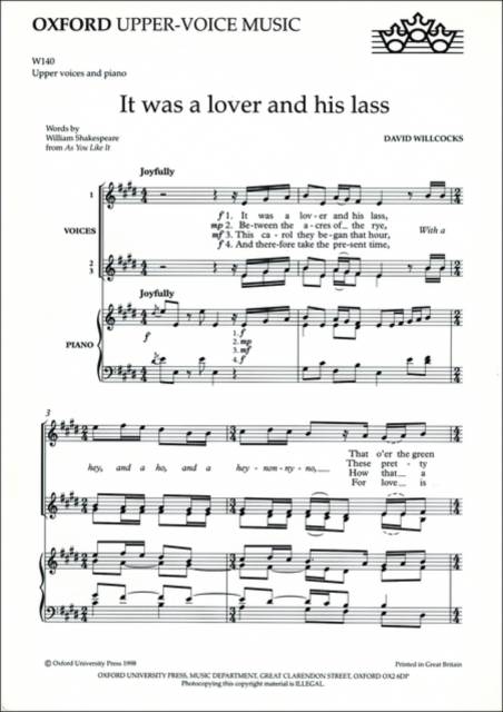 for three-part upper voices and piano or orchestraOne of five songs to texts from Shakespeare's plays which may be performed as a sequence under the title 'The Glories of Shakespeare', or individually. Orchestral material is available on hire and includes suggestions for linking narrations between the songs.