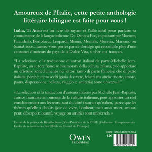 Amoureux de l’Italie, cette petite anthologie littéraire bilingue est faite pour vous ! Italia, Ti Amo est un livre distrayant et l’allié idéal pour parfaire sa connaissance de la langue italienne. De Dante à Eco, en passant par Morante, Pirandello, Bertolucci, Leopardi, Merini, Montale, Moravia, Marzano ou SantaCroce... laissez-vous porter par ce florilège qui rassemble plus d’une centaines d’auteurs du pays de la Dolce Vita, si cher aux français. “La selezione e la traduzione di autori italiani da parte Michelle Jean-Baptiste, un autore francese innamorata della cultura italiana, può apportare un effettivo arricchimento nei lettori tanto di parte francese che di parte italiana, perché i temi scelti (gioia di vivere, felicità ma anche morte, amore, paura, disperazione, belleza, viaggio o amicizia) sono universali.” « La sélection et la traduction d’auteurs italiens par Michelle Jean-Baptiste, autrice française amoureuse de la culture italienne, peut apporter un réel enrichissement aux lecteurs, tant du côté français qu’italien, parce que les thèmes qu’elle a choisis (joie de vivre, bonheur, mais aussi mort, amour, peur, désespoir, beauté, voyage ou amitié) sont universels. » Extrait de la préface de Rinaldo Rosso, Vice-Président de la FEDE (Fédération Européenne des Écoles de la conférence des OING au Conseil de l’Europe)