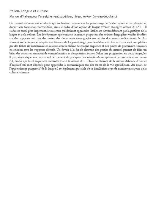 Ce manuel s’adresse aux étudiants qui souhaitent commencer l’apprentissage de l’italien après le baccalauréat et durant leur formation universitaire, dans le cadre d’une option de langue vivante étrangère niveau A1/A1+. Il s’adresse aussi, plus largement, à tous ceux qui désirent apprendre l’italien au niveau débutant par la pratique de la langue et de la culture. Les 16 séquences que contient le manuel proposent des activités langagières variées fondées sur des supports tels que des textes, des documents iconographiques et des documents audio-visuels, le plus souvent authentiques et adaptés aux besoins de l’apprentissage pour les débutants. Ces activités sont complétées par des fiches de vocabulaire en relation avec le thème de chaque séquence et des points de grammaire, toujours en relation avec les supports d’étude. Un devoir à la fin de chacune des parties du manuel permet de faire un bilan des acquis en situation de compréhension et d’expression écrites. Selon une progression en deux temps, les 8 premières séquences du manuel permettent de pratiquer des activités de réception et de production au niveau A1, tandis que les 8 séquences suivantes visent le niveau A1+. Plusieurs thèmes de la culture italienne d’hier et d’aujourd’hui sont abordés pour apprendre à communiquer sur des sujets de la vie quotidienne. Au cours de l’apprentissage progressif de la langue il est également possible de se familiariser avec de nombreux aspects de la culture italienne.