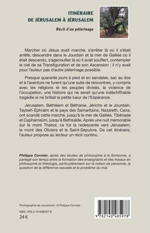 Marcher où Jésus avait marché, s'arrêter là où il s'était arrêté, descendre dans le Jourdain et la mer de Galilée où il était descendu, s'agenouiller là où il avait souffert, contempler le ciel de sa Transfiguration et de son Ascension : il n'y avait pour l'auteur pas d'autre pèlerinage possible. Presque quarante jours à pied et en sandales, sac au dos et à l'aventure ne furent qu'une suite de rencontres, y compris avec les religions et les peuples divisés, la violence de l'occupation, une histoire qui ne serait qu'une indéchiffrable tragédie si ne brillait la petite lueur de l'Espérance. Jérusalem, Bethléem et Béthanie, Jéricho et le Jourdain, Taybeh-Éphraïm et le pays des Samaritains, Nazareth, Cana, ont scandé cette marche, jusqu'à la mer de Galilée, Tibériade et Capharnaüm, jusqu'à Bethsaïde. Après une nuit mémorable sur le mont Thabor, ce fut la redescente vers Jérusalem, le mont des Oliviers et le Saint-Sépulcre. De cet itinéraire, l'auteur propose au lecteur un récit continu.