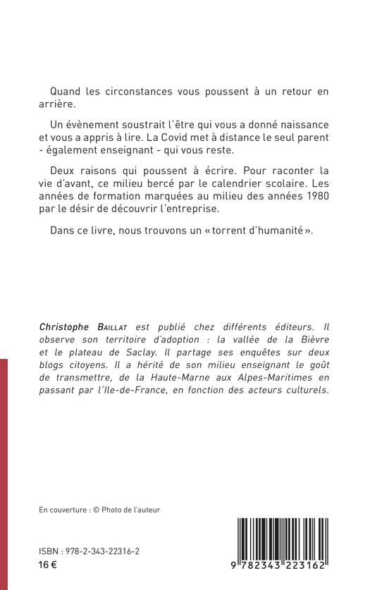 Quand les circonstances vous poussent à un retour en arrière. Un évènement soustrait l'être qui vous a donné naissance et vous a appris à lire. La Covid met à distance le seul parent - également enseignant - qui vous reste. Deux raisons qui poussent à écrire. Pour raconter la vie d'avant, ce milieu bercé par le calendrier scolaire. Les années de formation marquées au milieu des années 1980 par le désir de découvrir l'entreprise. Dans ce livre, nous trouvons un torrent d'humanité .