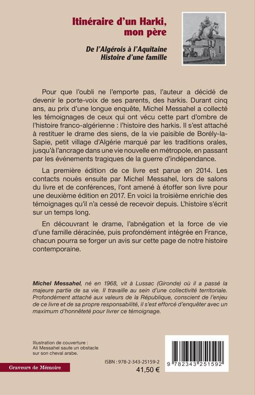 Pour que l’oubli ne l’emporte pas, l’auteur a décidé de devenir le porte-voix de ses parents, des harkis. Durant cinq ans, au prix d’une longue enquête, Michel Messahel a collecté les témoignages de ceux qui ont vécu cette part d’ombre de l’histoire franco-algérienne : l’histoire des harkis. Il s’est attaché à restituer le drame des siens, de la vie paisible de Borély-la- Sapie, petit village d’Algérie marqué par les traditions orales, jusqu’à l’ancrage dans une vie nouvelle en métropole, en passant par les événements tragiques de la guerre d’indépendance. La première édition de ce livre est parue en 2014. Les contacts noués ensuite par Michel Messahel, lors de salons du livre et de conférences, l’ont amené à étoffer son livre pour une deuxième édition en 2017. En voici la troisième enrichie des témoignages qu’il n’a cessé de recevoir depuis. L’histoire s’écrit sur un temps long. En découvrant le drame, l’abnégation et la force de vie d’une famille déracinée, puis profondément intégrée en France, chacun pourra se forger un avis sur cette page de notre histoire contemporaine.