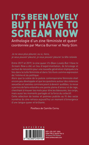 "Je ne veux plus pleurer, ou si, tiens, je veux pouvoir pleurer, je veux pouvoir pleurer la tête relevée" Entre 2017 et 2019, le zine queer "It's Been Lovely But I Have to Scream Now" a été un lieu d'expérimentation, de bricolage et surtout de rencontre pour une nouvelle génération impliquée à la fois dans la lutte féministe et dans l'écriture comme expression de l'intime et du politique. Alors que la scène de la poésie contemporaine féministe était encore peu développée et que les questions autour des violences sexuelles et sexistes commençaient à devenir audibles, la revue a permis de faire entendre une parole pleine d'amour et de rage, cherchant à trouver les mots pour dire les blessures, les corps, mais aussi les moments partagés et la force du collectif. Cette sélection de textes et poèmes publiés au fil des seize numéros du zine retrace aujourd'hui un moment d'émergence d'une langue queer et brûlante.