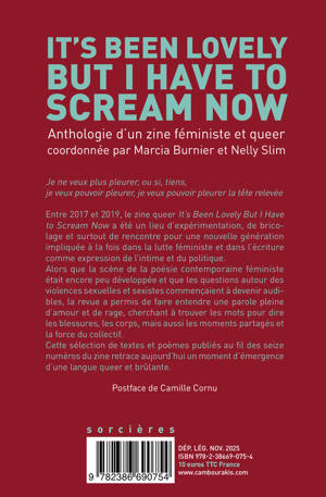 Entre 2017 et 2019, le zine queer It's Been Lovely But I Have to Scream Now a été un lieu d'expérimentation, de bricolage et surtout de rencontre pour une nouvelle génération impliquée à la fois dans la lutte féministe et dans l'écriture comme expression de l'intime et du politique. Alors que la scène de la poésie contemporaine féministe était encore peu développée et que les questions autour des violences sexuelles et sexistes commençaient à devenir audibles, la revue a permis de faire entendre une parole pleine d'amour et de rage, cherchant à trouver les mots pour dire les blessures, les corps, mais aussi les moments partagés et la force du collectif. Cette sélection de textes et poèmes publiés au fil des seize numéros du zine retrace aujourd'hui un moment d'émergence d'une langue queer et brûlante.