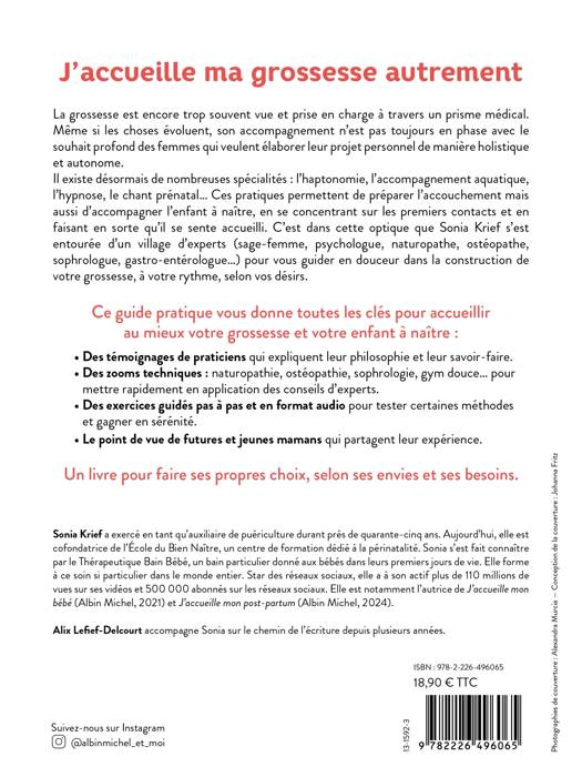 Il existe désormais de nombreuses spécialités : l'haptonomie, l'accompagnement aquatique, l'hypnose, le chant prénatal... Ces pratiques permettent de préparer l'accouchement mais aussi d'accompagner l'enfant à naître, en se concentrant sur les premiers contacts et en faisant en sorte qu'il se sente accueilli. C'est dans cette optique que Sonia Krief s'est entourée d'un village d'experts (sage-femme, psychologue, naturopathe, ostéopathe, sophrologue, gastro-entérologue...) pour vous guider en douceur dans la construction de votre grossesse, à votre rythme, selon vos désirs.