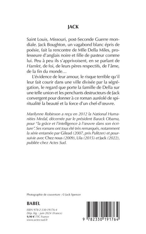 St. Louis, Missouri, post Seconde Guerre mondiale. Jack Boughton, un vagabond blanc épris de poésie, fait la rencontre de Miss Della Miles, professeure d'anglais noire, et fille de pasteur comme lui. L'évidence de leur amour, le risque qu'il leur fait courir dans une ville divisée par la ségrégation, le regard que porte la famille de Della sur une telle union et les penchants destructeurs de Jack convergent pour donner à ce roman auréolé de spiritualité la tension, la beauté et la grandeur d'un chef- d'oeuvre. Marilynne Robinson écrit ici la plus bouleversante des histoires d'amour, d'une profondeur vibrante d'émotion, qui met en jeu deux belles âmes, deux pensées, deux postures morales, deux coeurs purs.
