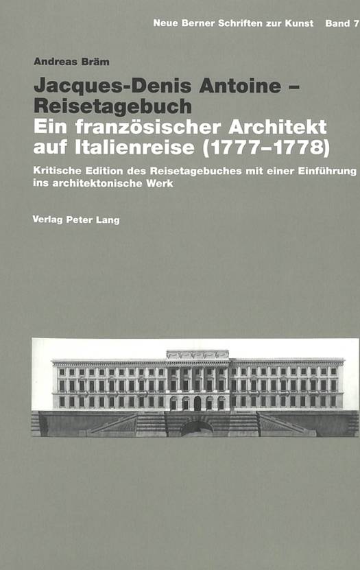 Der bedeutende französische Architekt Jacques-Denis Antoine (1733-1801) reiste in den Jahren 1777 bis 1778 über Lyon, Turin, Verona und Venedig nach Rom. Antoine, Erbauer der Pariser Münze, hat ein Carnet de voyage geschrieben (Paris, Bibliothek des Institut de France, Ms. 1913), in dem er alle besichtigten Bauten anführt und auf viele Skulpturen und Gemälde hinweist. Was ein praktizierender Architekt im Jahrhundert der Aufklärung in Italien suchte, lässt sich hier im Einzelnen verfolgen. Die Edition des Reisetagebuches wird begleitet von einem Abriss über Italienreisen von Architekten und Kunsttheoretikern sowie Notizen zum wenig erforschten Werk des Reisenden. Ein Anhang verzeichnet Bauten und Projekte Antoines.