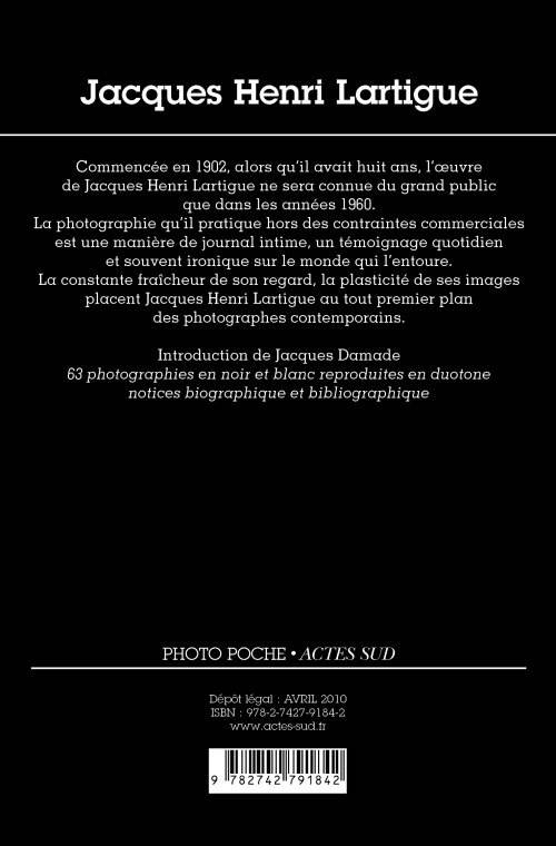 Disparu en 1986, Jacques-Henri Lartigue avait réalisé sa première photographie, en 1902, à l'âge de huit ans. Son oeuvre se lit comme le journal d'un enfant du siècle qui a consigné dans ses célèbres et multiples albums la chronique heureuse d'un monde en mutation. Aéroplanes, automobiles, manifestations sportives, belles dames du bois de Boulogne seront ses sujets de prédilection. Personnage facétieux et perpétuellement en quête d'innovations, il incarne une forme aboutie d'élégance appliquée à la photographie.