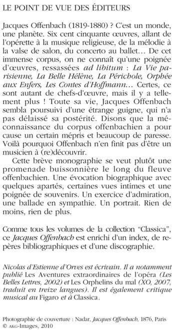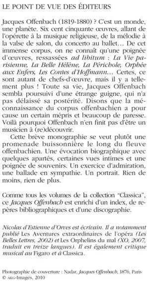 Burlesque et élégiaque, potache et romantique, ludique et lunaire, l'oeuvre d'Offenbach échappe aux typologies sommaires. On le dit "inventeur de l'opérette", mais c'est bien plus que ça : il a fondé un esprit et, en catalysant l'âme de son temps, s'est fait l'étrange alchimiste des moeurs du moment, plongeant l'art musical aussi bien dans l'analyse sociale que dans la charge politique, la parodie, le soupir nostalgique ou la savante gaudriole. Entre exercice d'admiration et promenade buissonière, cette brève monographie est une invitation à la redécouverte.
