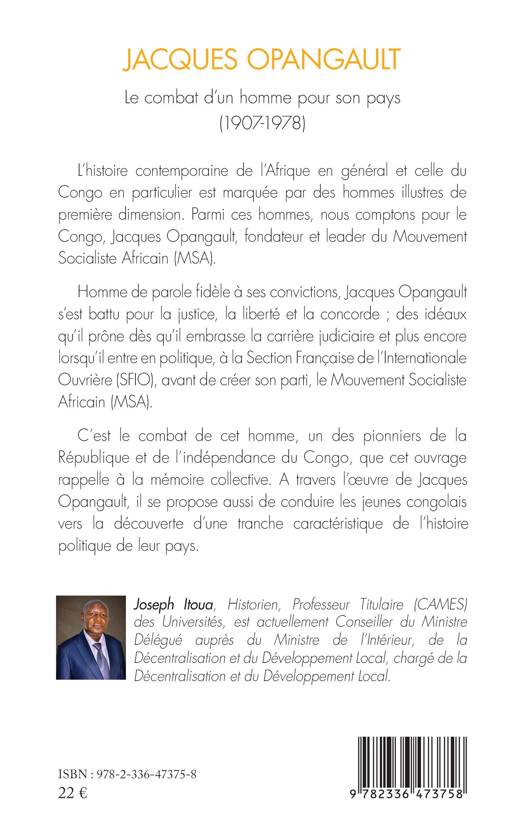 L’histoire contemporaine de l’Afrique en général et celle du Congo en particulier est marquée par des hommes illustres de première dimension. Parmi ces hommes, nous comptons pour le Congo, Jacques Opangault, fondateur et leader du Mouvement Socialiste Africain (MSA). Homme de parole fidèle à ses convictions, Jacques Opangault s’est battu pour la justice, la liberté et la concorde ; des idéaux qu’il prône dès qu’il embrasse la carrière judiciaire et plus encore lorsqu’il entre en politique, à la Section Française de l’Internationale Ouvrière (SFIO), avant de créer son parti, le Mouvement Socialiste Africain (MSA). C’est le combat de cet homme, un des pionniers de la République et de l’indépendance du Congo., que cet ouvrage rappelle à la mémoire collective. A travers l’œuvre de Jacques Opangault, il se propose aussi de conduire les jeunes congolais vers la découverte d’une tranche caractéristique de l’histoire politique de leur pays.