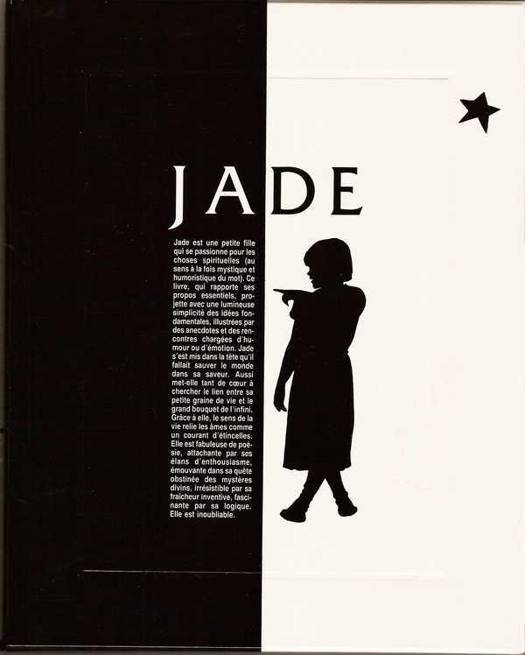 Jade est une petite fille qui se passionne pour les choses spirituelles (au sens à la fois mystique et humoristique du mot). Ce livre, qui rapporte ses propos essentiels, projette avec une lumineuse simplicité des idées fondamentales, illustrées par des anecdotes chargées d’humour ou d’émotion. Jade s’est mis dans la tête qu’il fallait sauver le monde dans sa saveur. Aussi met-elle tant de coeur à chercher le lien entre sa petite graine de vie et le grand bouquet de l’infini. Grâce à elle, le sens de la vie relie les âmes comme un courant d’étincelles. Elle est fabuleuse de poésie, attachante par ses élans d’enthousiasme, émouvante dans sa quête obstinée des mystères divins, irrésistible par sa fraîcheur inventive, fascinante par sa logique. Elle est inoubliable.