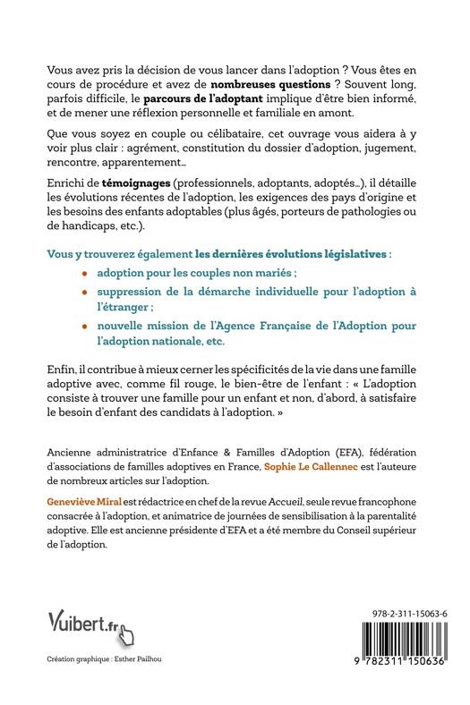 Jalonné de témoignages de professionnels, d'adoptants et d'adoptés, pratique et concret (encadrés, chiffres clés), cet ouvrage accompagne les postulants à l'adoption, parfois perdus dans les démarches à entreprendre. Il aborde notamment les étapes administratives pour l’agrément, l’enquête psychosociale, les enfants dits « à besoins spécifiques », les organismes intermédiaires, les procédures, les étapes finales (jugement, transcription à l’état civil), la gestion des particularités de la vie dans une famille adoptive...