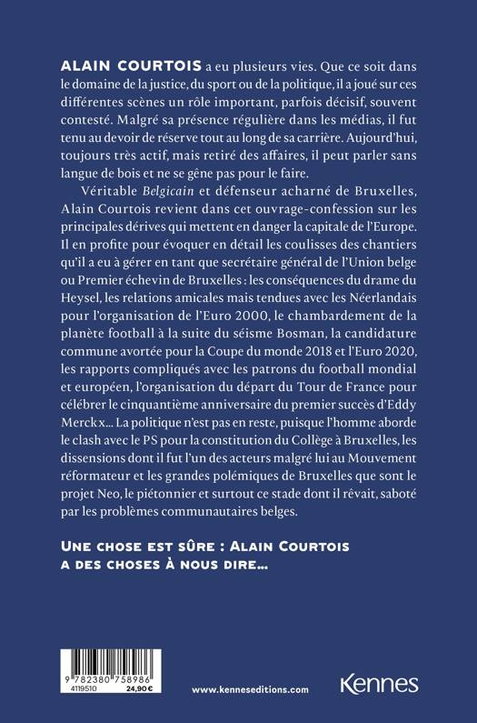 Véritable Belgicain et défenseur acharné de Bruxelles, Alain Courtois revient dans cet ouvrage-confession sur les principales dérives qui mettent en danger la capitale de l’Europe. Il en profite pour évoquer en détail les coulisses des chantiers qu’il a eu à gérer en tant que secrétaire général de l’Union belge ou Premier échevin de Bruxelles : les conséquences du drame du Heysel, les relations amicales mais tendues avec les Néerlandais pour l’organisation de l’Euro 2000, le chambardement de la planète football à la suite du séisme Bosman, la candidature commune avortée pour la Coupe du monde 2018 et l’Euro 2020, les rapports compliqués avec les patrons du football mondial et européen, l’organisation du départ du Tour de France pour célébrer le cinquantième anniversaire du premier succès d’Eddy Merckx… La politique n’est pas en reste, puisque l’homme aborde le clash avec le PS pour la constitution du Collège à Bruxelles, les dissensions dont il fut l’un des acteurs malgré lui au Mouvement réformateur et les grandes polémiques de Bruxelles que sont le projet Neo, le piétonnier et surtout ce stade dont il rêvait, saboté par les problèmes communautaires belges.