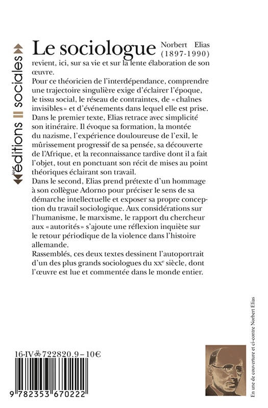 Norbert Elias revient, ici, sur sa vie et sur la lente élaboration de son oeuvre. Pour ce théoricien de l'interdépendance, comprendre une trajectoire singulière exige d'éclairer l'époque, le tissu social, le réseau de contraintes, de chaînes invisibles et d'événements dans lequel elle est prise. Dans le premier texte, Elias retrace avec simplicité son itinéraire. Il évoque sa formation, la montée du nazisme, l'expérience douloureuse de l'exil, le mûrissement progressif de sa pensée, sa découverte de l'Afrique, et la reconnaissance tardive dont il a fait l'objet, tout en ponctuant son récit de mises au point théoriques éclairant son travail. Dans le second, il prend prétexte d'un hommage à Adorno pour préciser le sens de sa démarche intellectuelle et exposer sa propre conception du travail sociologique. Aux considérations sur l'humanisme, le marxisme, le rapport du chercheur aux autorités s'ajoute une réflexion inquiète sur le retour périodique de la violence dans l'histoire allemande.