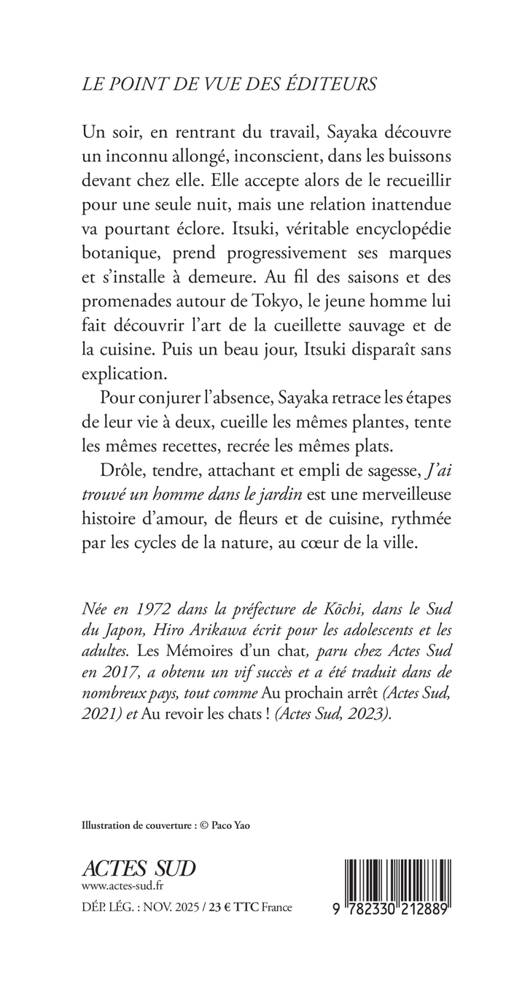 Un soir, en rentrant du travail, Sayaka découvre un inconnu allongé, inconscient, dans les buissons devant chez elle. Elle accepte alors de le recueillir pour une seule nuit, mais une relation inattendue va pourtant éclore. Itsuki, véritable encyclopédie botanique, prend progressivement ses marques et s'installe à demeure. Au fil des saisons et des promenades autour de Tokyo, le jeune homme lui fait découvrir l'art de la cueillette sauvage et de la cuisine. Puis un beau jour, Itsuki disparaît sans explication. Pour conjurer l'absence, Sayaka retrace les étapes de leur vie à deux, cueille les mêmes plantes, tente les mêmes recettes, recrée les mêmes plats. Drôle, tendre, attachant et empli de sagesse, "J'ai trouvé un homme dans le jardin" est une merveilleuse histoire d'amour, de fleurs et de cuisine, rythmée par les cycles de la nature, au coeur de la ville.