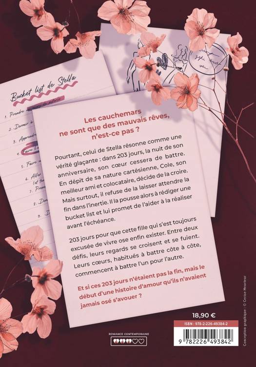 En dépit de sa nature cartésienne, Cole, son meilleur ami et colocataire, décide de la croire. Mais surtout, il refuse de la laisser attendre la fin dans l'inertie. Il la pousse alors à rédiger une Bucket List et lui promet de l'aider à la réaliser avant l'échéance. 203 jours pour que cette fille qui s'est toujours excusée de vivre ose enfin exister.