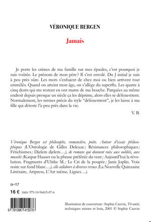 Jamais est le monologue d'une femme âgée, Sarah, en proie à une débandade psychique. De nombreux reproches sont adressés à sa fille, qui n'est pas nommée. Une confession. Elle dure une heure, de 18 h à 18 h 59. Comme un combat de boxe lexical. Une histoire de langage. Mais un langage poussé à ses extrêmes-limites...