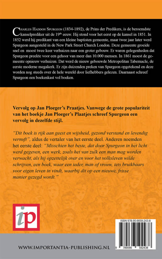 Vervolg op Jan Ploeger's Praatjes. Vanwege de grote populariteit van het boekje Jan Ploeger's Plaatjes schreef Spurgeon een vervolg in dezelfde stijl.