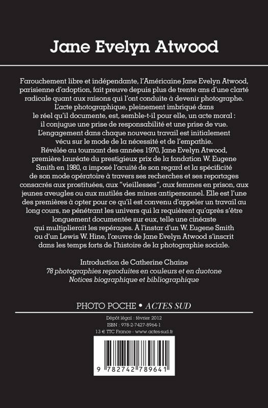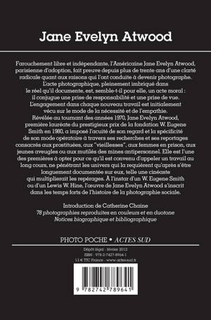 Farouchement libre et indépendante, l'Américaine Jane Evelyn Atwood, parisienne d'adoption, fait preuve depuis plus de trente ans d'une clarté radicale quant aux raisons qui l'ont conduite à devenir photographe. L'acte photographique, pleinement imbriqué dans le réel qu'il documente, est, semble-t-il pour elle, un acte moral : il conjugue une prise de responsabilité et une prise de vue. L'engagement dans chaque nouveau travail est initialement vécu sur le mode de la nécessité et de l'empathie. Révélée au tournant des années 1970, Jane Evelyn Atwood, première lauréate du prestigieux prix de la fondation W. Eugene Smith en 1980, a imposé l'acuité de son regard et la spécificité de son mode opératoire à travers ses recherches et ses reportages consacrés aux légionnaires, aux "vieillesses", aux jeunes aveugles ou aux mutilés des mines antipersonnel. Elle est l'une des premières à opter pour ce qu'il est convenu d'appeler un travail au long cours, ne pénétrant les univers qui la requièrent qu'après s'être longuement documentée sur eux, telle une cinéaste qui multiplierait les repérages. A l'instar d'un W. Eugene Smith ou d'un Lewis Hine, l'oeuvre de Jane Evelyn Atwood s'inscrit dans les temps forts de l'histoire de la photographie sociale.