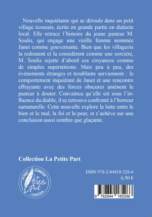 Nouvelle inquiétante qui se déroule dans un petit village écossais, écrite en grande partie en dialecte local. Elle retrace l’histoire du jeune pasteur M. Soulis, qui engage une vieille femme nommée Janet comme gouvernante. Bien que les villageois la redoutent et la considèrent comme une sorcière, M. Soulis rejette d’abord ces croyances comme de simples superstitions. Mais peu à peu, des événements étranges et troublants surviennent : le comportement inquiétant de Janet et une rencontre effrayante avec des forces obscures amènent le pasteur à douter. Convaincu qu’elle est sous l’influence du diable, il se retrouve confronté à l’horreur surnaturelle. Cette nouvelle explore la lutte entre le bien et le mal, la foi et la peur, et s’achève sur une conclusion aussi sombre que glaçante. Markheim est une nouvelle psychologique qui explore le combat intérieur d’un homme après avoir commis un meurtre dans une boutique d’antiquités à Londres, le jour de Noël. Après avoir tué le marchand sous prétexte d’acheter un cadeau, Markheim fouille la maison à la recherche d’argent. Il est alors visité par un personnage mystérieux et surnaturel, qui le confronte à sa vie de péchés. À travers un dialogue tendu et philosophique, Markheim est forcé de faire face à la vérité sur lui-même, ses choix et la possibilité de rédemption. L’histoire aborde les thèmes de la conscience, de la morale, et du combat entre le bien et le mal au sein de l’âme humaine.