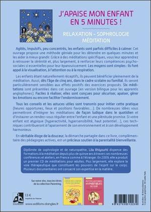 Agités, impulsifs, peu concentrés, les enfants sont parfois difficiles à calmer. Cet ouvrage propose une méthode géniale pour les détendre en quelques minutes et les aider à mieux grandir. Grâce à des méditations spécifiques, vous leur apprendrez à retrouver la sérénité et, plus largement, à renforcer leurs compétences psychosociales si essentielles pour leur épanouissement. Les moyens sont simples : ils font appel à la visualisation, à l'attention ou à la respiration. Les enfants étant naturellement réceptifs, ils peuvent bénéficier pleinement de la méditation. Aussi, dès l'âge de cinq ans, dans le cadre scolaire ou familial, ils seront particulièrement sensibles aux effets positifs des exercices proposés. Six méditations sont présentées dans cet ouvrage (en version bilingue pour les apprentis anglophones). Faciles à réaliser, elles sont conçues pour sécuriser, apaiser, gérer les émotions ou encore faciliter l'endormissement. Tous les conseils et les astuces utiles sont transmis pour initier cette pratique (heures opportunes, lieux et positions favorables…). De nombreuses idées vous permettront d'intégrer les méditations de façon ludique dans le quotidien et d'instaurer un rendez-vous régulier entre l'enfant et une plénitude promise. Si votre enfant est atypique (hyperactivité, hypersensibilité, haut potentiel…), ces techniques contribueront à l'apaisement de son environnement et à son développement harmonieux. En véritable éloge de la douceur, la démarche partagée dans ce livre, complémentaire des pédagogies actives, est un véritable soutien à la parentalité bienveillante.