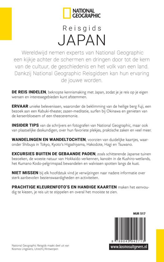 Boekbeschrijving: De National Geographic Reisgids Japan voert je langs bekende plekken als de majestueuze Fuji-vulkaan, keizerlijk Kyoto, hypermodern en flitsend Tokyo en vele andere schitterende Japanse bezienswaardigheden. Je maakt kennis met unieke belevenissen als het bijwonen van een Kabuki-voorstelling of een theeceremonie, surfen bij Okinawa en zazen-meditatie. Ga buiten de gebaande paden door de woeste natuur van Hokkaido te verkennen of te kanoën in de Kushiro-wetlands. De National Geographic Reisgids Japan is een complete kennismaking met Japan voor reizigers die verder willen gaan en het land in al zijn aspecten willen leren kennen.