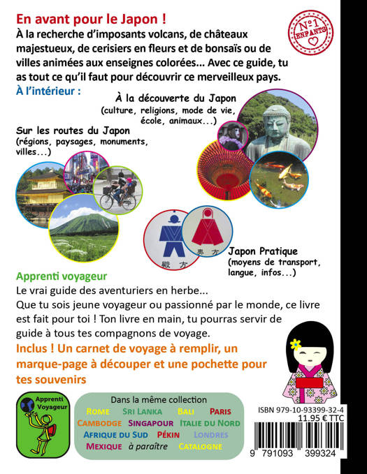 En avant pour le Japon ! Le vrai guide des aventuriers en herbeâ! À la recherche d’imposants volcans, de châteaux majestueux, de cerisiers en fleurs et de bonsaïs, ou de villes animées aux enseignes colorées... Destiné aux jeunes, voyageurs ou passionnés par le monde, ce livre contient tout ce qu’il faut pour appréhender ce pays passionnant et servir de guide à tous ses compagnons de voyage. Contenu : Une section pour découvrir le Japon : géographie, histoire, culture, mode vie, religions, animaux... Une section de visite du pays par thème : régions, paysages, monuments, villes. Une section pratique : moyens de transport, langue, infos pratiques, conseils... Les petits plus : une mise en page attractive (colorée, textes courts, nombreuses photos et illustrations), une section pour décrire ses expériences de voyage, une pochette pour conserver ses souvenirs, un marque-page à découper.