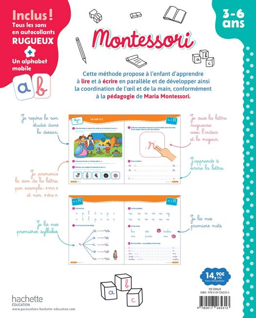 Cette méthode propose à l’enfant d’apprendre à lire et à écrire en parallèle, et de développer ainsi la coordination de l’œil et de la main, conformément à la pédagogie de Maria Montessori. L’approche de cet ouvrage est phonétique : chaque lettre émet un son. De grandes lettres rugueuses à toucher sont proposées en autocollant : plus de 50 autocollants rugueux de grande taille sont disponibles dans l’ouvrage, correspondant à tous les sons, digrammes et phonèmes complexes.