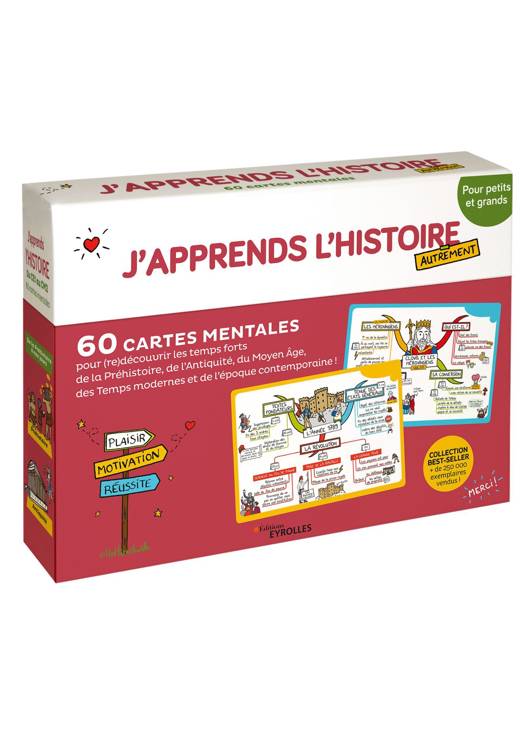 Pour réviser ses leçons d'histoire en s'amusant ! La mythologie, Jules César, Charlemagne, François Ier, les châteaux de la Loire, Louis XIV, la Révolution française, la Seconde Guerre mondiale, la construction européenne... Ce coffret joyeux et ludique permettra à votre enfant (et à vous aussi !) de réviser avec bonheur toutes les leçons d'histoire qu'il découvre à l'école primaire. Ces cartes mentales sont idéales pour (re)découvrir les dates importantes et les personnages historiques majeurs à connaître. Les cartes font apparaître clairement la structure de chaque leçon. Et grâce aux couleurs et aux dessins, votre enfant retient l'essentiel plus facilement !