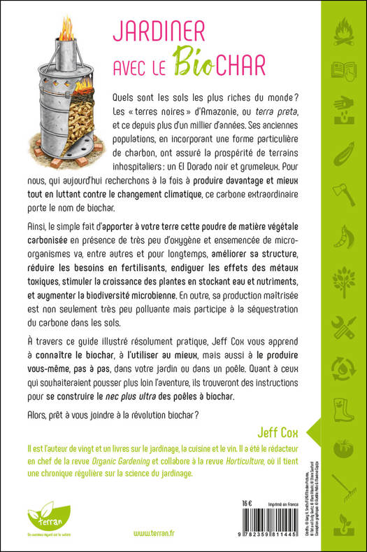 Les sols les plus riches du monde sont les « terres noires » d’Amazonie, ou terra preta. Ses anciennes populations y ont incorporé une forme particulière de charbon, qui porte le nom de "biochar". Le simple fait d’apporter à votre terre cette poudre de matière végétale carbonisée en présence de très peu d’oxygène et ensemencée de micro-organismes va améliorer sa structure, réduire les besoins en fertilisants, endiguer les effets des métaux toxiques, stimuler la croissance des plantes en stockant eau et nutriments, et augmenter la biodiversité microbienne. En outre, sa production maîtrisée est non seulement très peu polluante mais participe à la séquestration du carbone dans les sols. Jeff Cox vous apprend à connaître le biochar, à l’utiliser au mieux, mais aussi à le produire vous-même, pas à pas, dans votre jardin ou dans un poêle. Quant à ceux qui souhaiteraient pousser plus loin l’aventure, ils trouveront des instructions pour se construire le nec plus ultra des poêles à biochar.