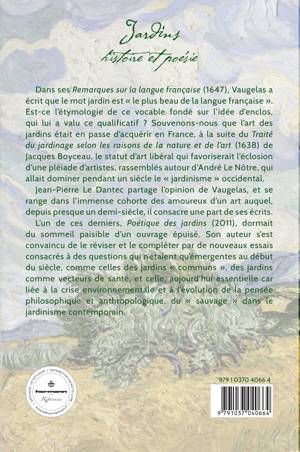 Dans ses Remarques sur la langue française (1647), Vaugelas a écrit que le mot jardin est « le plus beau de la langue française ». Est-ce l’étymologie de ce vocable fondé sur l’idée d’enclos, qui lui a valu ce qualificatif ? Souvenons-nous que l’art des jardins était en passe d’acquérir en France, à la suite du Traité du jardinage selon les raisons de la nature et de l’art (1638) de Jacques Boyceau, le statut d’art libéral qui favoriserait l’éclosion d’une pléiade d’artistes, rassemblés autour d’André Le Nôtre, qui lui-même allait dominer pendant un siècle le « jardinisme » occidental. Jean-Pierre Le Dantec partage l’opinion de Vaugelas, et se range dans l’immense cohorte des amoureux d’un art auquel, depuis presque un demi-siècle, il consacre une part de ses écrits. L’un de ces derniers, Poétique des jardins (2011), dormait du sommeil paisible d’un ouvrage épuisé. Son auteur s’est convaincu de le réviser et le compléter par de nouveaux essais consacrés à des questions qui n’étaient qu’émergentes au début du siècle, comme celles des jardins « communs », des jardins comme vecteurs de santé, et celle, aujourd’hui essentielle car liée à la crise environnementale et à l’évolution de la pensée philosophique et anthropologique, du « sauvage » dans le jardinisme contemporain.