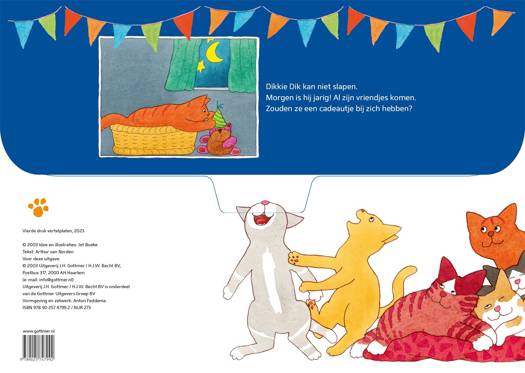 Dikkie Dik is jarig en wil niets liever dan de kaarsjes op zijn verjaardagstaart uitblazen en de taart vervolgens oppeuzelen, maar er moet nog een hoop gebeuren voor het poezenfeestje kan beginnen: de slingers moeten worden opgehangen, alle poezenvrienden moeten nog arriveren... Zou Dikkie Dik zo lang kunnen wachten? Op een crèche of in de klas voorlezen is nóg leuker en makkelijker met vertelplaten. De 17 stevige, losse A3-platen passen in een standaard vertelkastje (niet meegeleverd), maar de verteller kan ze natuurlijk ook gewoon zelf vasthouden.