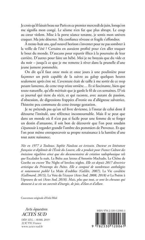 "Je ne prétends pas qu'un tel livre devienne, à l'instar de celui dont il détourne l'intitulé, une référence incontournable. Mais il se peut que dans un monde où il n'est pas si facile pour une femme de se forger un destin d'amazone, il soit bon de découvrir que l'on peut soudain s'épanouir à regarder grandir l'ombre des pommiers de Provence. Et que l'on peut même entrapercevoir sa propre renaissance à la lumière d'une tout autre naissance." Sophie Nauleau