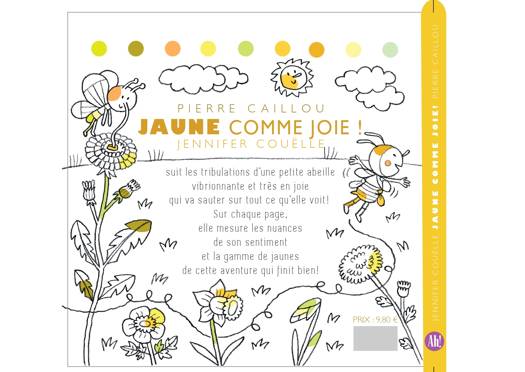 Ah! se propose de transformer le livre de coloriage en album<br /> de fiction qui fait la part belle à l’apprentissage des émotions.<br /> Je suis jaune comme joie !, suit les tribulations d’une petite abeille vibrionnante et très en joie qui va sauter sur tout ce qu’elle voit !<br /> Sur chaque page, elle mesure les nuances de son sentiment et de la gamme de jaunes de cette aventure qui finit bien !
