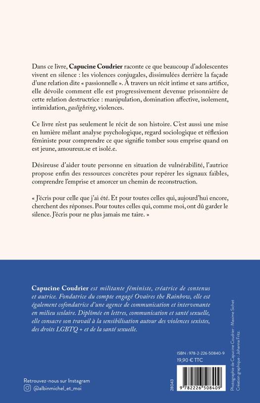Dans ce livre, Capucine Coudrier raconte ce que beaucoup d'adolescentes vivent en silence : les violences conjugales, dissimulées derrière la façade d'une relation dite « passionnelle ». À travers un récit intime et sans artifice, elle dévoile comment elle est progressivement devenue prisonnière de cette relation destructrice : manipulation, domination affective, isolement, intimidation, gaslighting, violences.