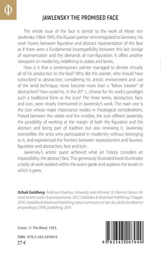How is it that a contemporary painter managed to devote virtually all of his production to the face ? Why did this painter, who should have subscribed to abstraction, considering his artistic environment and use of the serial technique, never become more than a « fellow traveler » of abstraction ? How could he, in the 20th C, choose for his work's paradigm such a traditional form as the icon ? The three terms, abstraction, face, and icon, were closely intertwined in Jawlensky's work. The main one is the icon whose major importance resides in theological considerations. Poised between the visible and the invisible, the icon offered Jawlensky the possibility of working at the margin of both the figurative and the abstract and being part of tradition but also renewing it. Jawlensky exemplifies the artist who participated in modernity without belonging to it, and experienced the frontiers between expressionism and fauvism, figuration and abstraction, face and icon.