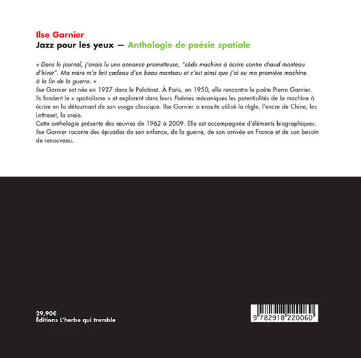 Cette anthologie réunit des œuvres de 1962 à 2009, inédites ou épuisées, porte d’entrée idéale dans l’univers visuel aussi discret que fascinant d’Ilse Garnier. La démarche spatialiste ? Si le point de départ est bien le mot, c’est pour le transformer en image ; le mot doit présenter des possibilités, des capacités à devenir image. Cette image sublimera le mot et sera interprétée de façon différente selon le lecteur. « Les œuvres ici rassemblées permettent de prendre la mesure de l’expérience spatiale et de sa valeur. Quel que soit le caractère avant-gardiste des recherches formelles qu’elle développe, cette poésie n’a pas rompu avec son histoire. Elle fait écho, en les poussant un peu plus loin peut-être, à ces tentatives de dénuement, de “parcimonie”, que l’on trouve dans un tout autre registre, vers les années soixante, chez André du Bouchet, Guillevic ou, dans une certaine mesure, dans les Airs de Philippe Jaccottet. C’est en ce sens que l’œuvre d’Ilse Garnier a bien quelque chose à nous dire sur le monde et pas seulement sur la matière du langage. » (Philippe Blondeau, postface.)