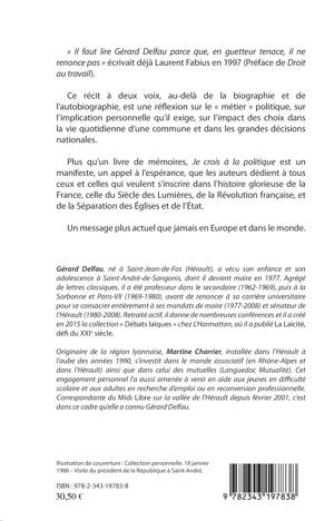 « Il faut lire Gérard Delfau parce que, en guetteur tenace, il ne renonce pas » écrivait déjà Laurent Fabius en 1997 (Préface de Droit au travail). Ce récit à deux voix, au-delà de la biographie et de l'autobiographie, est une réflexion sur le métier politique, sur l'implication personnelle qu'il exige, sur l'impact des choix dans la vie quotidienne d'une commune et dans les grandes décisions nationales. Plus qu'un livre de mémoires, cet ouvrage est un manifeste, un appel à l'espérance, dédié à tous ceux et celles qui veulent s'inscrire dans l'histoire glorieuse de la France, celle du Siècle des Lumières, de la Révolution française et de la séparation des Églises et de l'État.