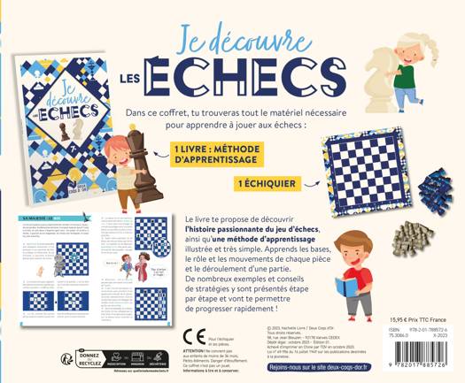 Dans ce coffret, tu trouveras tout le matériel nécessaire pour apprendre à jouer aux échecs : un livre de méthode d’apprentissage et un échiquier.
