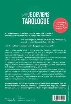 "Nouvelle édition revue et mise à jour du livre Devenir tarologue". Qui n’a jamais rêvé de suivre sa propre voie ? Qui n’a jamais ressenti l’envie de répondre à l’appel de son moi profond ? Si vous lisez ces lignes, c’est sans doute que devenir tarologue est un projet qui vous tient à cœur. Déjà, plusieurs questions mêlées de joie et d’appréhension se bousculent dans votre esprit : suis-je prêt à me lancer ? Comment me faire connaître ? Compagnon idéal pour vous guider à chaque étape de la création de votre activité, ce guide pratique fourmille de conseils avisés, d’exemples concrets, de méthodes de tirage personnalisables et de témoignages inspirants. Il vous aidera à éviter les erreurs, à identifier et dépasser vos éventuelles peurs pour passer à l’action. Précisément, il vous sera utile pour fixer vos tarifs, déclarer votre activité, communiquer avec authenticité ou faire face aux situations difficiles… Bref, ce livre a le pouvoir de transformer votre vie et de vous offrir le plus beau des cadeaux : vivre pleinement de votre passion.