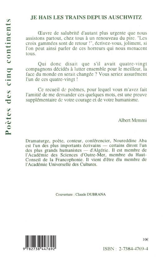 Œuvre de salubrité d'autant plus urgente que nous assistons partout, chez tous à un renouveau du pire. "Les croix gammées sont de retour!", écrivez-vous, joliment, si l'on peut ainsi parler de ces horreurs qui nous menacent tous. Qui donc disait que s'il avait quatre-vingt compagnons décidés à lutter ensemble pour le meilleur, la face du monde en serait changée? Vous seriez assurément l'un de ces quatre-vingt ! Ce recueil de poèmes, pour lequel vous m'avez fait l'amitié de me demander ces quelques mots, est une preuve supplémentaire de votre courage et de votre humanisme.