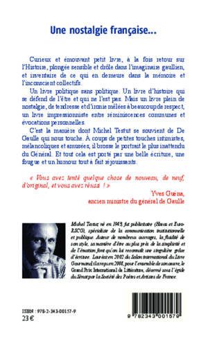 "Curieux et émouvant petit livre, à la fois retour sur l'Histoire, plongée sensible et drôle dans l'imaginaire gaullien, et inventaire de ce qui en demeure dans la mémoire et l'inconscient collectifs. C'est la manière dont Michel Testut se souvient de De Gaulle qui nous touche. À coups de petites touches intimistes, mélancoliques et amusées, il brosse le portrait le plus inattendu du Général".