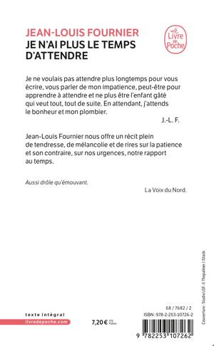 Jean-Louis Fournier nous offre un récit plein de tendresse, de mélancolie et de rires sur la patience et son contraire : nos impatiences, nos urgences, notre rapport au temps.