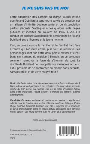 Cette adaptation des Carnets en marge, journal intime que Roland Dubillard a tenu toute sa vie ou presque, est un alliage d'intimité bouleversante et de distanciation parfois glaçante. S'attaquer à ces quelque mille pages publiées et inédites qui courent de 1947 à 2003 a conduit les auteures à dédoubler le personnage de Roland Dubillard entre l'homme et le jeune homme. L'un, en colère contre le familier et le familial, fait face à l'autre qui l'observe effaré, puis tout se renverse. Les personnages sont pris entre deux pôles : exister et créer. Dans ces carnets, du malaise à l'espoir, on se demande comment retrouver la force de s'étonner de tout. La révolte de Dubillard nous rappelle nos méandres actuels : est-il possible de se confronter au monde sans béquille, sans pacotille, et de vivre malgré tout ?