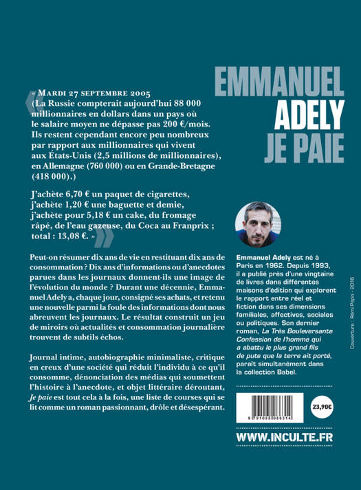 Peut-on résumer dix ans de vie en restituant dix ans de consommation quotidienne ? Dix ans d'informations ou d'anecdotes parues dans les journaux donnent-ils une image de l'évolution du monde ? Durant une décennie, Emmanuel Adely a, chaque jour, consigné ses achats, et retenu une nouvelle parmi la foule des informations dont nous abreuvent les journaux. Le résultat, intitulé «Je paie», construit une autobiographie minimaliste où nouvelles du monde et consommation journalière trouvent de subtils échos, des jeux de miroir. Journal intime, critique en creux d'une société qui réduit l'individu à ce qu'il consomme (à moins que la consommation ne soit devenu le dernier refuge de l'intime, le marqueur sociologique ultime), dénonciation des médias qui soumettent l'histoire à l'anecdote, et incroyable objet littéraire, «Je paie» est tout cela à la fois : un puzzle dont chaque jour est une pièce surprenante qui s'emboîte aux autres pour donner un tableau fi nal aussi drôle que désespérant. «Je paie» est une liste de courses qui se lit comme un roman passionnant.