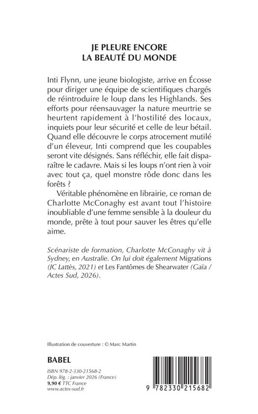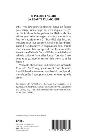 Inti Flynn, une jeune biologiste, arrive en Écosse pour diriger une équipe de scientifiques chargés de réintroduire le loup dans les Highlands. Ses efforts pour réensauvager la nature meurtrie se heurtent rapidement à l'hostilité des locaux, inquiets pour leur sécurité et celle de leur bétail. Quand elle découvre le corps atrocement mutilé d'un éleveur, Inti comprend que les coupables seront vite désignés. Sans réfléchir, elle fait disparaître le cadavre. Mais si les loups n'ont rien à voir avec tout ça, quel monstre rôde donc dans les forêts ? Véritable phénomène en librairie, ce roman de Charlotte McConaghy est avant tout l'histoire inoubliable d'une femme sensible à la douleur du monde, prête à tout pour sauver les êtres qu'elle aime.
