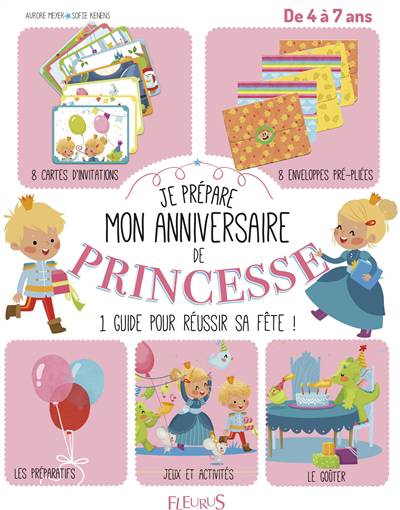 8 cartes d'invitation, des enveloppes pré-pliées assorties, des autocollants pour fermer les enveloppes et un guide à destination des parents pour organiser facilement la fête avec son enfant : les préparatifs, les jeux, les activités et le goûter.