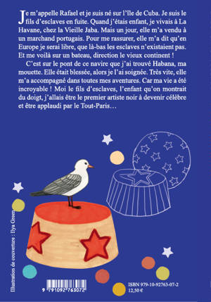 Je m’appelle Rafael et je suis né sur l’île de Cuba. Je suis le fils d’esclaves en fuite. Quand j’étais enfant, je vivais à La Havane, chez la Vieille Jaba. Mais un jour, elle m’a vendu à un marchand portugais. Pour me rassurer, elle m’a dit qu’en Europe je serai libre, que là-bas les esclaves n’existaient pas. Et me voilà sur un bateau, direction le vieux continent ! C’est sur le pont de ce navire que j’ai trouvé Habana, ma mouette. Elle était blessée, alors je l’ai soignée. Très vite, elle m’a accompagné dans toutes mes aventures. Car ma vie a été incroyable ! Moi le fils d’esclaves, l’enfant qu’on montrait du doigt, j’allais être le premier artiste noir à devenir célèbre et à être applaudi par le Tout-Paris…